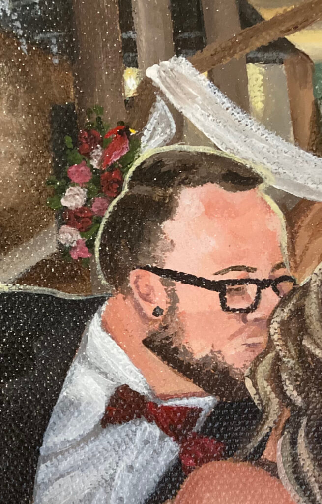 A live wedding painting is more than just a piece of art; it’s a personalized keepsake that you can treasure forever. Unlike other wedding favors or decorations, this painting is a one-of-a-kind creation made just for you. The live wedding painter can include specific details that are meaningful to you, making it an intimate and personal reflection of your wedding day. For instance, at my wedding, I included a small cardinal in the arch florals in memory of my late grandfather. Our artist beautifully incorporated this detail into the painting, making it even more special and significant. Every time you look at the painting, you’ll be transported back to that moment, reliving the joy and love.